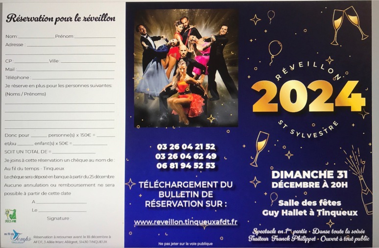 Samedi 31 décembre : Réveillon de la Saint-Sylvestre à la Salle des Fêtes.